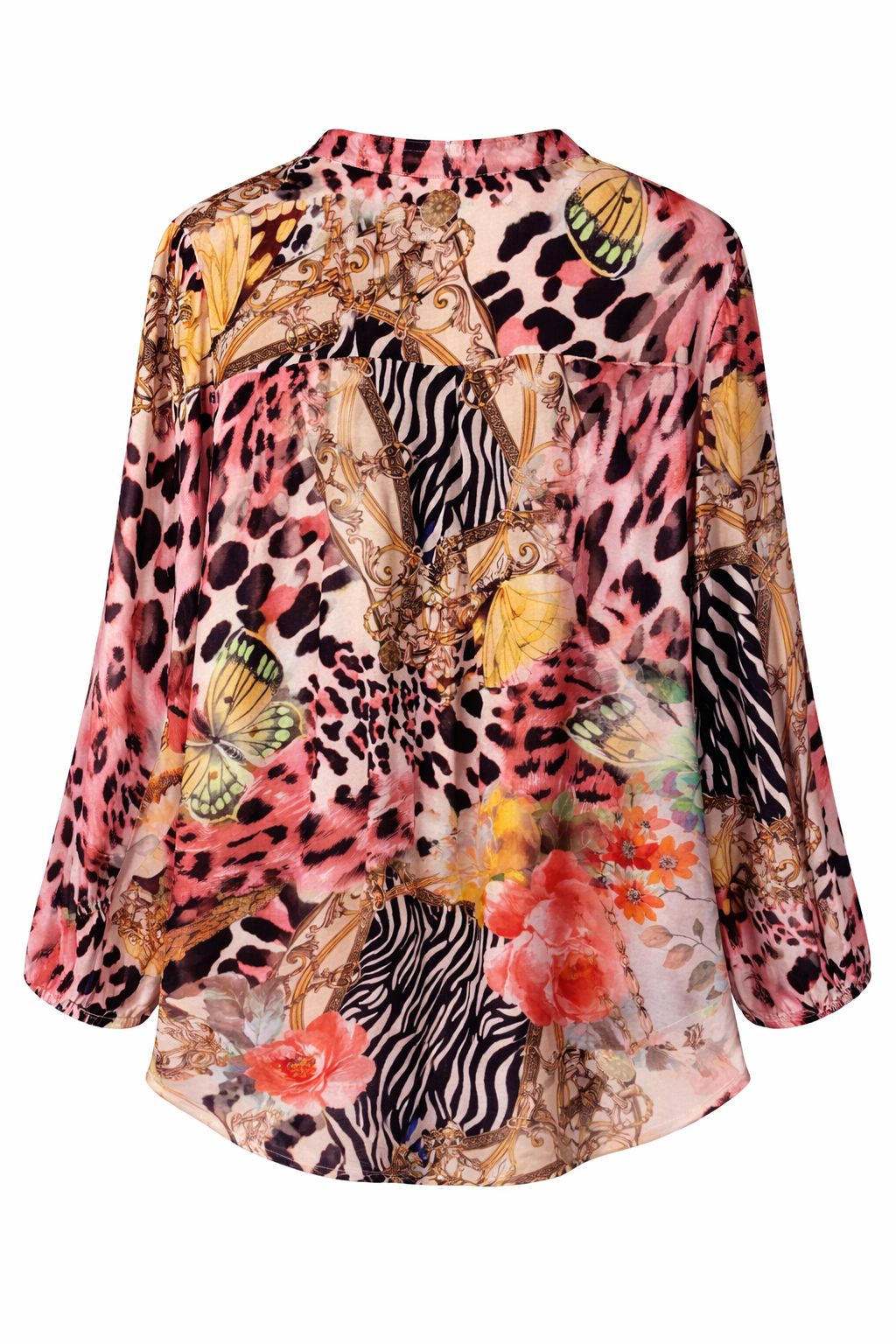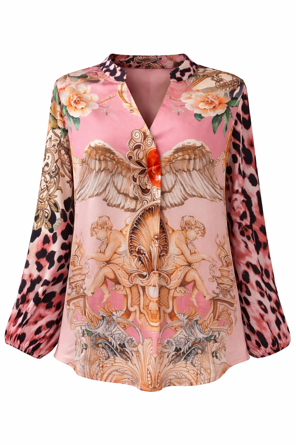 Diese außergewöhnliche Bluse vereint romantische Elemente mit modernem Animal-Print und kunstvollen Barockdetails. Das aufwendig gestaltete Design mit floralen Akzenten, Engelsmotiven und Leo-Elementen macht jedes Outfit zu einem echten Statement.